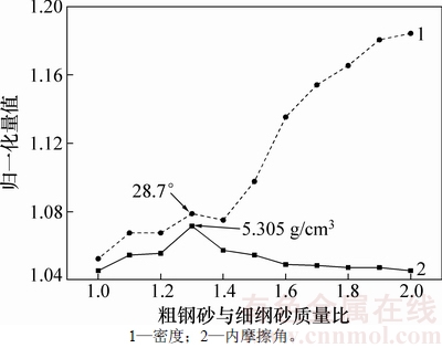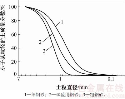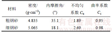 模型试验填料选用钢砂,增加填料密度。为了获取更大密度和更合理的强度参数,模型试验采用的填料是将2种钢砂按照一定质量比均匀混合得到。这2种钢砂的力学参数见表2,级配曲线见图3。采用粗钢砂与细钢砂质量配比的范围定在为1:1至2:1,2种将不同质量比例的钢砂均匀混合,测试相应混合材料的密度及内摩擦角。混合后材料的参数变化曲线如图1所示。图1中,竖轴为归一化量值,它表示测试参数(密度、内摩擦角)与2种钢砂相应参数的平均值之比,水平轴为混合质量比(粗钢砂与细钢砂质量比)。测试结果表明:随着混合比增大,内摩擦角基本上单调增大,而密度曲线则出现单个峰值,此时,混合质量比为1.3:1.0,与该比例对应的内摩擦角为28.7°。这个内摩擦角在密实中砂的内摩擦角范围内,故选该混合比1.3:1.0为缩尺模型试验填料配制的混合质量比,配制的材料参数见表3,钢砂的级配曲线见图2。由于混合钢砂的密度为5.305 g/cm3,大致相当于普通密实中砂的3倍,缩尺模型可以模拟尺寸为其3倍的原型,故几何相似比n取3。