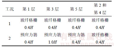 预应力筋的预拉力使其相邻层玻纤格栅所承担的水平土压力降低,客观上增加了玻纤格栅的强度。在堆载作用下,玻纤格栅对填料的约束作用会继续发挥,因而,混合加筋土挡墙中预应力筋和玻纤格栅的作用仍然可以协调工作。