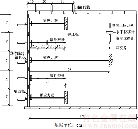 3) 玻纤格栅的应变。在每层玻纤格栅上按照距离墙面板的位置布置4个应变片,应变片布置在玻纤格栅的纵肋上,以测定玻纤格栅经向应变。