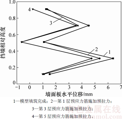 图6所示为工况2施加预拉力过程中的墙面板水平位移变化规律。从图6可见:预应力筋的预拉力能显著减小预拉力施加层及其相邻层面板的位移,对于非相邻层的面板位移几乎没有影响。这是由于面板采用的是模块式拼接面板,相邻层之间有搭接。