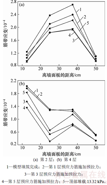 填筑完成时,水平土压力由预应力筋、墙面板以及玻纤格栅共同承担。随着预应力筋的预拉力增加,墙面板对填料的约束增强,内部水平土压力增大,玻纤格栅应变变小,预应力筋上的预拉力将一部分原本由玻纤格栅所承担的水平土压力转移到无黏结预应力筋上,预应力筋的主动约束占主导地位。随着堆载进行,玻纤格栅应变和水平土压力均有一定程度增大,堆载所产生的附加水平土压力由预应力筋和玻纤格栅共同承担。