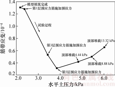 图10所示为工况2中第4层玻纤格栅上距离面板25 cm处的应变与该位置水平土压力的关系。从图10可以看出曲线可以分为2段:在施加第3层和第5层预拉力的过程中,玻纤格栅应变快速减小而水平土压力在增大;在堆载过程中,玻纤格栅应变随着水平土压力的增大而增大。
