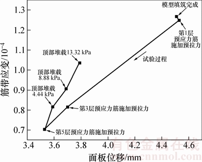 图11所示为工况2第4层平均玻纤格栅应变与第4层墙面板水平位移的关系曲线。从图11可以看出:在预拉力施加过程中,玻纤格栅应变随着墙面板水平位移减小而减小;在堆载过程中,玻纤格栅应变随着墙面板水平位移的增大而增大,这说明玻纤格栅作用与墙面板的水平位移有关。