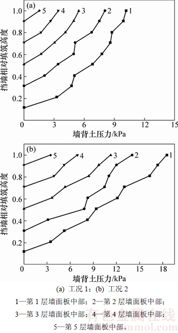 在2个工况下,填筑过程中墙背土压力的变化见图12。从图12可知:在填筑过程中,各层墙面板的墙面板中部墙背土压力均随填筑高度的增大而增大;在混合加筋土挡墙中,墙面板中部墙背土压力与填筑高度基本上呈正比,这一现象在预应力筋位置的墙面板中部墙背土压力表现得更为突出;而在普通加筋土挡墙中,随着填筑高度增加,墙面板中部墙背土压力增长幅度变小,这主要是由于随着挡墙高度增加,普通加筋土挡墙墙面逐渐发生水平变形而导致侧向土压力减小。在混合加筋土挡墙中,预应力筋采用的是钢绞线,其弹性模量高,变形小,对填料的约束较大,因此,墙面板中部墙背土压力会随着填筑高度的增加呈线性增大趋势。