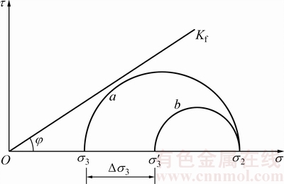 在普通加筋土挡墙墙面板内侧取一处于静止状态的填料单元体。假定墙面板光滑,则竖直方向为其大主应力方向,水平方向为其小主应力方向。加筋土单元莫尔圆见图15,其中,应力圆a表示其应力状态。设Kf为填料强度包线,由于填料单元体处于静止状态,圆a应在Kf线之下。在混合加筋土挡墙中,取相同位置处的填料单元体,其竖向自重荷载不变,大主应力σ1与普通加筋土挡墙的相同。由于预应力筋对填料的约束作用比玻纤格栅对填料的约束作用更加明显,且通过对预应力筋施加预拉力,使混合加筋土挡墙内部的水平土压力比普通加筋土挡墙的大,混合加筋土挡墙的小主应力σ3’比普通加筋土挡墙对应位置处的更大,在小主应力不超过竖向大主应力的条件下,图15中应力圆b表示其应力状态,填料单元也处于弹性稳定状态。从图15可以看出:相对于普通加筋土挡墙,混合加筋土挡墙中填料单元的应力圆离Kf线更远,安全系数更高。因此,在填筑完成时,相比普通加筋土挡墙,混合加筋土挡墙的平均墙面板水平位移减小51.6%;在顶部堆载作用下,混合加筋土挡墙的平均墙面板水平位移增量和平均墙顶沉降分别减小89.4%和73.6%。混合加筋土挡墙中,预应力筋的主动约束机制增大了填料的围压,使混合加筋土挡墙具有更高的安全系数,从而减小混合加筋土挡墙的竖向沉降和墙面板水平位移。