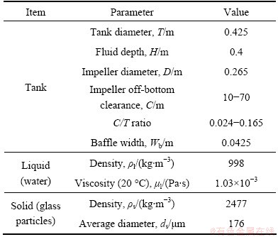 The tank made of plexiglass was set on a iron stand that was convenient for observing the solids suspension on the tank bottom. Two special baffles in width of 0.1T were mounted perpendicular to the tank wall and had a slope with an angle of 120° on the bottom of them. A cover with measuring holes was on the top of the tank. The shaft and impeller were made of stainless steel. The ratio of impeller off-bottom clearance to tank diameter (C/T) was from 0.024 to 0.165, and the impeller rotational speed was from 150 to 330 r/min. Water and glass particles were used as liquid and solid phases respectively. The solid hold-up was set at αav=0.323 (800 g/L). The model dimensions and material properties are listed in Table 1.