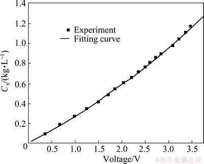 SHAN et al [15] used this probe to study the solid concentration profile in an unbaffled stirred tank, and an accuracy of 0.5% for the concentration measurement was observed. The measuring principle was that a beam of measuring light is sent out from the probe to the fluid and the intensity of reflected light is linearly proportional to the solid concentration. Then the photoelectric sensor receives the reflected light and converts it into voltage signal. The calibrating curve of solid concentration and voltage is shown in Fig. 3. Moreover, the value of solid concentration can be calculated by the following equation: