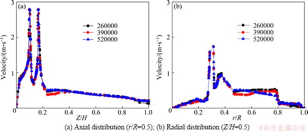 In this study, three grid sizes of 260000, 390000 and 520000 were considered to investigate the effect of grid size on velocity and solids hold-up distribution under the conditions of C/T=0.071, D/T=0.624, N=250 r/min. The predicted results using different grids are listed in Figs. 6 and 7, respectively. The differences of velocity and solid hold-up distributions in the axial and radial directions were found to be very small (~5%). Based on these results, all the subsequent simulations were carried out with about 260000 computational cells.