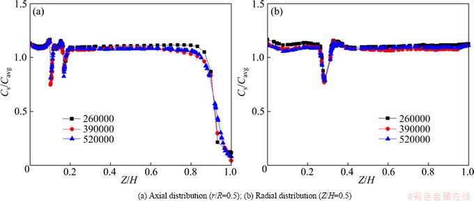 Fig. 12 Comparison of axial and radial solid concentration profiles for N=250 r/min