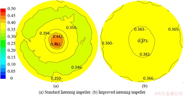The solid volume fraction distribution on the tank bottom is shown in Fig. 8. The solid hold-up near the wall and at the center of tank bottom is larger than that of other place where is well stirred. Especially, a large number of solids settled at the center of tank bottom using the standard Intermig impeller, where may easily cause the solid deposition. In contrast, the solids distribute more uniform at the whole bottom, which indicates that the improved Intermig impeller is better for solid suspension.