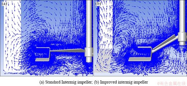 Figure 9 shows the velocity vector distribution between the standard and improved Intermig impeller. Under the interaction between the baffles and impeller, secondary circulation loops are generated. It is apparent that the improved one coupled with sloped baffles provides a stronger axial circulation and more power for solid suspension. When the improved Intermig impeller rotates in clockwise direction, the external blades exert a force inclined downwards on the fluid flow and the baffles with a slope change particles motion into the upward direction. So subjected to the interactions between the baffles and impeller, the stronger secondary circulation loops can provide more kinetic energy for solid suspension. Moreover, the power consumption of standard and improved Intermig impellers is 40.6 W and 31.7 W respectively. Therefore, compared with the standard Intermig impeller and vertical baffles, the improved one coupled with sloped baffles can not only enhance solid suspension, but also promote circulation loops for mixing. Above all, more than 20% of the power consumption is saved.