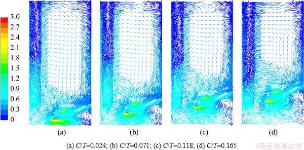 Figure 10 shows the two-dimensional velocity vector at a rotational speed of 250 r/min with different impeller off-bottom clearances (C/T=0.024-0.165). It can be seen from flow patterns that the strong secondary circulation loop flow with higher velocity generates between the impeller and baffles, and then spreads to the upper part of the tank. At lower impeller off-bottom clearance, due to the strong action between the impeller and the slopes, the fluid can be pumped to higher place. When C/T=0.024, the secondary loop develops sufficiently and the circulating flow can reach the liquid surface. On the contrary, when increasing C/T to 0.165, the interaction between the impeller and baffles is weakened. The secondary circulation loops can not reach the top of the liquids, where there is no enough kinetic energy to maintain the solid particles in suspension.
