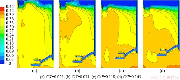 Figure 11 shows the solids volume fraction distribution under the conditions of a rotational speed of 250 r/min and C/T from 0.024 to 0.165. The flow profiles show that the angle of discharge (with reference to the vertical) increases with an increase in the clearance, and this explains the increased solid accumulation with an increase in the impeller clearance. On one hand, a low clearance causes the turbulence decaying less. On the other hand, the interaction between the impeller and baffles is enhanced at a low clearance. So the solid particles can be pumped to the higher place at lower clearance (C/T=0.024) and distribute uniformly and few clear liquid regions exist.