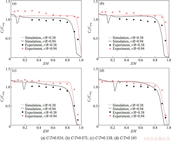 Figure 12 shows the solid concentration profile in axial and radial directions at the same conditions of Fig. 11. The radial positions of measuring points were selected near shaft and baffles, and the axial positions were from the tank bottom to the liquid surface. From the simulated and experimental results, the solid concentration is a little bit lower near the shaft than that close to the baffles, which is caused by the centrifugal force of a rotating impeller. At the same impeller off-bottom clearance, the height of clear liquid (Cs/Cavg<1) is also larger under the condition of r/R=0.38 than that under r/R=0.94. In contrast, when increasing the C/T, the solid concentration changes more under the condition of r/R=0.94. The difference of solid concentration between the two radial positions becomes smaller at a higher C/T. It is necessary to point out that the solid concentration in axial has an extreme at r/R=0.38, which is due to less solid distribution around the impeller discharge zone.