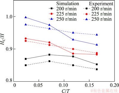 The solid cloud heights with different N and C/T were measured in the experiment and simulation, respectively. The experimental values of Hc were determined visually from outside the tank by measuring the distance between the tank bottom and the cloud surface. The cloud height in numerical simulation was defined as the maximum axial height of an iso-surface of solid phase volume fraction. KASAT et al [19] proposed a criterion of the iso-surface defined as the average solid phase volume fraction.
