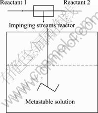 Impinging streams (IS) reactor, prepared through micro-machining and precision machining technology, is a small response system. The streams impinge in the microchannel, resulting in an increased mass transfer for reaction and allowing for a decrease in the geometric size of the system [4]. The mixing characteristic size is between several microns and several hundreds microns. So, the length is greatly shortened. Relying on molecule diffusion, IS can realize perfect mixing within extremely short time (millisecond grade). Therefore, IS can provide intensified micromixing which is crucial to create a homogeneous environment for nucleation. Utilizing this advantage for preparing nanometer or submicron inorganic materials with regular morphology is a brand-new field. It has been reported that TiO2, ZnO, and Mg(OH)2 dyes and gold nanoparticles were synthesized by impinging streams reactors [5-10]. MORTEZA and BEHROOZ [11] have investigated the residence time distribution and application of the continuous two impinging streams reactor in liquid-liquid reactions using modeling and experiment methods. CHARINRAT and SAKAMON [12] studied the flow and mixing behavior of impinging streams by numerical simulation.