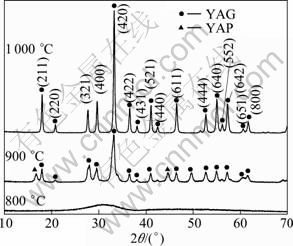 For YAG phosphor system, the directly synthesized particles in co-precipitation have amorphous phase. Post-treatment process at high temperatures is required for the crystallization of as-prepared particles. In the present work, powders annealed at 800-1 000 °C for 2 h in air were characterized by means of XRD. Figure 3 reveals the XRD patterns of the powder produced by IS-CP method. The powders are found to be amorphous until 800 °C. At 900 °C, different phases which are a mixture of YAG and YAP are observed. At 1 000 °C, the hexagonal YAP (YAlO3) phase disappears and cubic YAG (Y3Al5O12) is the only phase, with crystalline cell constants a=b=c=12.009 ?, which are in good agreement with JCPDS Card (No.33-0040). Refinement of peak shapes and intensities reveals crystallite growth of the powders as the temperature increases.
