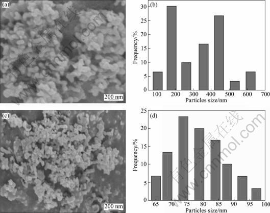 Fig. 4 SEM morphologies and particle size distribution of Y2.90Ce0.1Al5O12 powders synthesized by method of D-CP (a), (b) and T (1) (c), (d) (Sintered at 1 000 °C for 2 h, c0 = 0.22 mol/L, qv, L=6 mL/min)