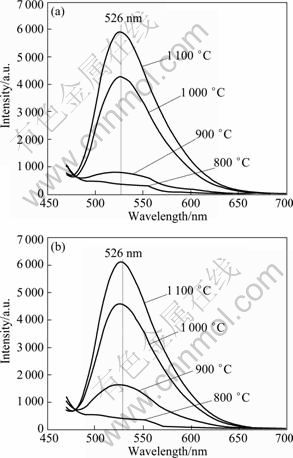 Fig. 5 Emission (λex=450 nm) spectra of Y2.90Ce0.1Al5O12 phosphors synthesized by method of D-CP(a) and T(1) (b) (c0 =0.22 mol/L, qv,L=6 mL/min)