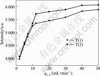 Reynolds numbers Re (Re=ρqv/0.785μd) are about 456, 228 and 547.2 in the mixing channel of impinging streams reactor when the flow rates are 10 mL/min, 5 mL/min and 12 mL/min in the experimental conditions, respectively. KOCHMANN et al [24] found that the flow located in the transition zone at Re 250-300. When Re is higher than 400, the flow exists as turbulence state in the T-shaped microchannel reactor. For small reaction pore size, the flow is mixed mainly on diffusion when the flow is laminar at low rate and efficient mixing is achieved by diffusion combined with turbulence at high flow velocity of turbulent state. So, micromixing time is shortened and the degree of supersaturation uniformity is improved with the increase of the fluid turbulence intensity, which in turn results in small particle size, narrow particle distribution, and favors the doping Ce3+ into YAG lattice. So, the luminescent intensity increases with the increasing flow rate. However, when the flow rate increases to a certain value, the micromixing rate is very fast, the impact of micromixing is weakened and nucleation process is controlled kinetically. Consequently, the luminous intensities of particles change little with increasing the flow rate at this time.