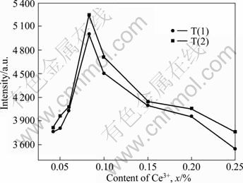 Figure 7 shows the emission spectra of Y3-xCexAl5O12 particles at different doping contents of Ce. The as-prepared particles were annealed at 1 000 °C for 2 h. The emission intensity does not increase monotonically with the cerium content as mentioned in previous reports [26]. The intensity firstly increases then decreases with the increasing Ce3+ doping content. The maximum luminescent intensity is shown at 1.67% (molar fraction) Ce (x=0.083%). This is because, at low content, the number of luminescent centers gradually increases in the YAG matrix with the increasing Ce3+ doping content and the corresponding emission intensity increases. While at high content, the intensity decreases because of incomplete activation of Ce under the above mentioned annealing conditions and leads to coexistence of YAG and CeO2.