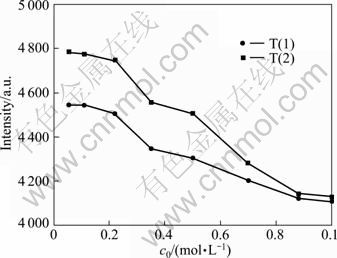 Fig. 8 Emission (λex=450 nm) spectra of Y2.90Ce0.1Al5O12 phosphors synthesized by T(1) and T(2) at different initial concentrations (Sintered at 1 000 °C for 2 h, qv,L=6 mL/min)