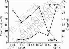 Fig.4 Creep and creep rupture properties of BTi-6431S and other common high temperature titanium alloy at 650 ℃