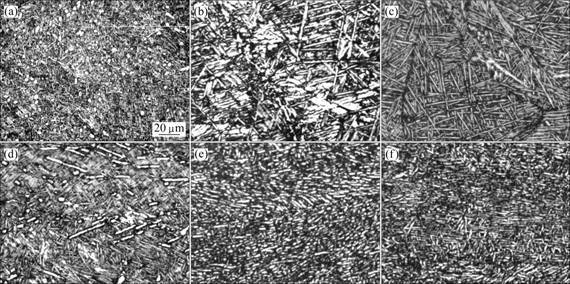 Fig.6 Microstructures of typical BTi-6431S alloy products: (a) d23 mm, bar; (b) d30 mm, sheet; (c) d2.0 mm, sheet; (d) d2.0 mm, sheet; (e) d2.0 mm, sheet; (f) d2.0 mm, sheet