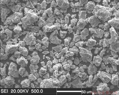 Figure 1 shows the SEM image of the high energy mechanically milled Ti-45Al-5.5(Cr,Nb,B,Ta) powder. The grains show unequal shape and the size of grains ranges from several micrometer to scores of micrometers. Figure 2 shows the XRD pattern of the high energy mechanically milled Ti-45Al-5.5(Cr,Nb,B,Ta) powder. From the XRD pattern, it can be found that the Ti3Al and TiAl are the major phases, which shows that after 0.5 h high energy mechanical milling the powders have almost reacted each other. In addition, the intensity of peaks of XRD pattern indicates that the amount of Ti3Al phase is more than that of TiAl phase. Both the peaks of two phases are broader and exhibit shoulders, which indicate the trend of transiting of Ti3Al and TiAl phases to amorphous and decreasing of grain size.