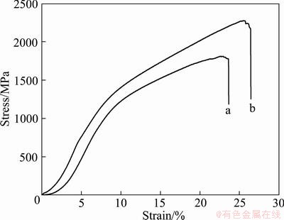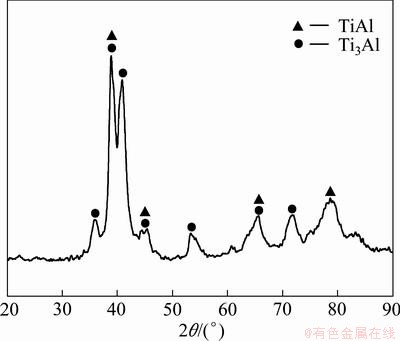 The milled TiAl based alloy powder was sintered under pressure of 50 MPa at 900 and 1000 °C by DR. Sinter 1050 SPS furnace. The holding time at the sintering temperature was 5 min. The size of the sintered samples was d30 mm×(5-6) mm. The sintered samples were heat treated at 1360 °C for 0.5 h. The Vickers hardness was measured by a HV-5 Vickers tester with a load of 49 N for 30 s. Circular specimens with size of d3 mm×5 mm were machined from the sintered samples. The Instron 5500 testing machine was used for compressive tests, and the strain rate was 0.5 mm/s.