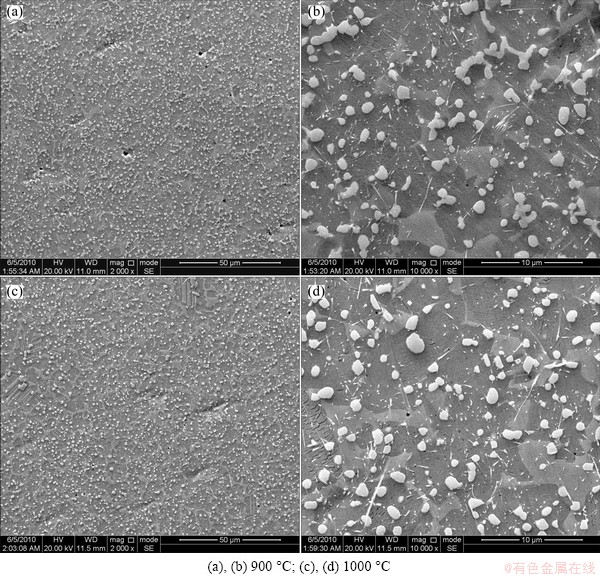 Figure 3 shows the SEM images of the bulk samples sintered and consolidated by SPS of Ti-45Al-5.5(Cr,Nb, B,Ta) powder at different temperatures after heat treatment at 1360 °C for 0.5 h. After heat treatment the microstructure is not the equiaxed near gamma grain with some TiB2 phases as the microstructure without heat treatment as referred in Ref. [8], but the duplex structure with some fine equiaxed gamma grains and thin needle TiB2 phases. From Fig. 3, it can also be found that the character of duplex structure is obvious in the microstructure of bulk samples SPSed at 1000 °C than that at 900 °C, but the grain size changed a little. The samples SPSed at both the temperatures exhibit compact structure with few pores.