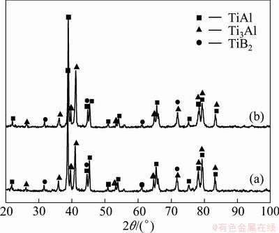 XIAO et al [8] indicated that with the SPS temperature increasing the peak intensity of TiAl phase decreased, and that of Ti3Al and TiB2 phases increased in the sintered bulk TiAl alloy sample before heat treatment. From Fig. 4 it could be found that after heat treatment more TiAl phases transferred to Ti3Al phases. Due to heat treatment at temperature of α+γ phase area, more α2/γ lamellar columns appeared, so that the microstructure of TiAl alloy prepared at higher SPS temperature is with much character of duplex structure, which is similar to the results from microstructure observation.