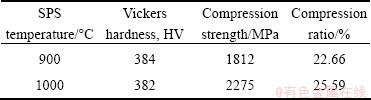 3) With the SPS temperature increasing from 900 °C to 1000 °C, the micro-hardness changed hardly, the compression strength increased from 1812 MPa to 2275 MPa, and the compression ratio increased from 22.66% to 25.59%. The compression fracture mode of the samples was likely to be intergranular fracture.
