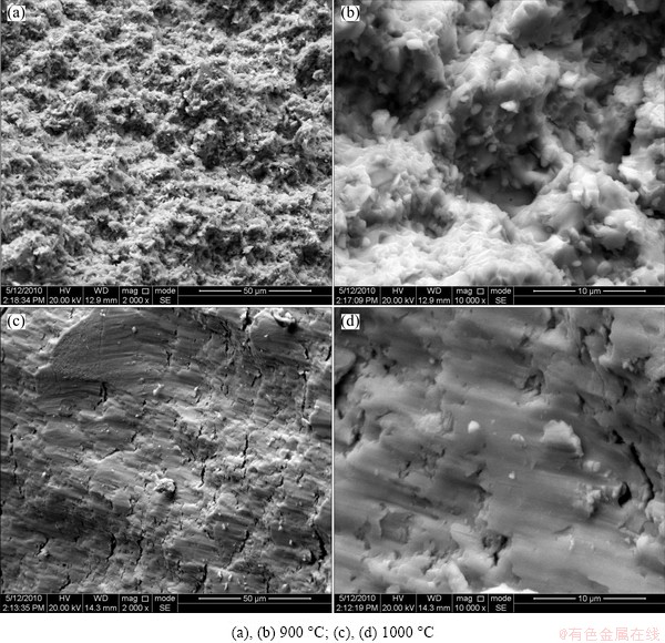 Figure 6 shows the fracture morphologies of the compression test samples of sintered Ti-45Al- 5.5(Cr,Nb,B,Ta) after heat treatment. From Fig. 6, it is clearly showed that the plasticity of the alloy sintered at 1000 °C is better than that at 900 °C. The fracture of both kinds of samples is likely to be intergranular fracture.
