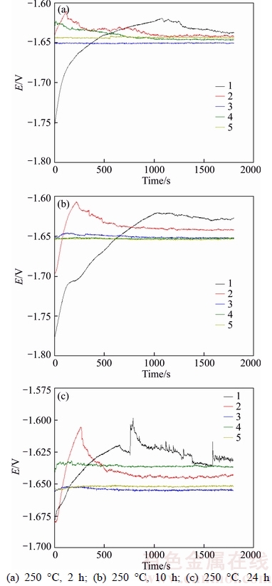 Figure 2 Effect of aging system on open circuit potential:(1: Mg–0.25Y; 2: Mg–2.5Y; 3: Mg–5Y; 4: Mg–8Y;5: Mg–15Y)