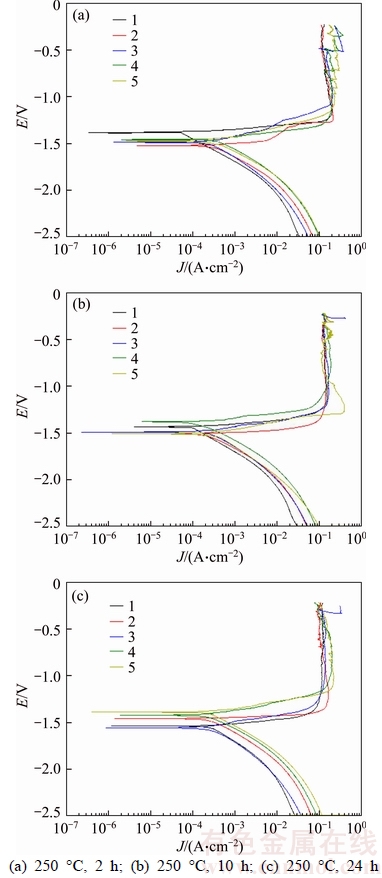 Figure 3 Effect of aging system on polarization curve of alloy:(1: Mg–0.25Y; 2: Mg–2.5Y; 3: Mg–5Y; 4: Mg–8Y;5: Mg–15Y)