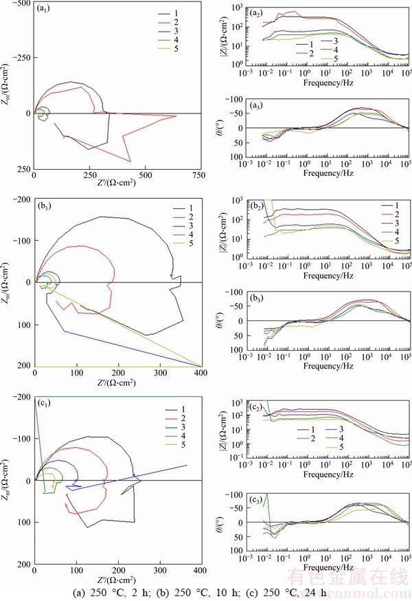Figure 4 Effect of aging system on impedance spectra of alloy:(1: Mg–2.5Y; 2: Mg–8Y; 3: Mg–15Y; 4: Mg–8Y; 5: Mg–0.25Y)