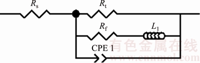 The phase angle of Mg–Y alloy was more than 45°, and the maximum phase angle of the high- frequency arc exceed 70°. According to |Z| versus frequency curve in the Pourbaix diagram, the |Z| increase law of Mg–Y alloy was as follows: Mg–0.25Y As observed in the Bode diagram [18], the phase angle decreased with increasing of Y content within the entire test frequency range, which indicated that the strong pitting corrosion feature of the alloy in the electrode surface activation process gradually increased. However, once the corrosion product layer was generated, the impedance modulus would gradually increase, and the capability to prevent ions from invading gradually enhanced, thus effectively suppressing the pitting process. Judged on this basis, the corrosion product layer of the alloy would become more dense and effective along with increasing of Y content. The Nyquist diagram for the early corrosion was the inductive arc in the low frequency region, which was mainly because there was a layer of oxidation film on the alloy surface and the film would be damaged with increasing of the corrosion time. When the oxidation film was damaged, the reaction would occur on the alloy surface, so the inductive arc would become the capacitive arc. According to the corrosion mechanism and corrosion morphology, and based on the electrochemical corrosion principle, the equivalent circuit is shown in Figure 5, where Rs is the solution resistance, Rt is the charge transfer resistance, CPE is the constant phase angle element, Rf is the film resistance and L1 refers to inductance. The impedance spectrum curves of Mg–(0.25, 2.5, 5 and 8) alloys were simulated according to the equivalent circuit. The parameters of the circuit components are shown in Table 3. Figure 5 Equivalent circuit According to the analysis results of the Nyqiust curve equivalent circuit, the sum of the charge transfer resistance Rt and the surface corrosion film resistance Rf of the double electric layer forming on the interface between the high frequency capacitive arc surface and the corrosion medium for Mg–2.5Y alloy is the largest among the five alloys. This means that the corrosion film of this alloy has the largest impedance value, so the corrosion film layer could produce the best effect of protection. When the Y content was lower or higher than 2.5%, a difference would occur between the Y content in the film layer and the proportion of the α-phase, resulting in the poor density of the film layer, so it cannot provide the effective protection to the base metal. At the same aging temperature, the second phase precipitated from the solid solution with the extension of the aging time and the protection property of the film layer forming on the alloy surface decrease, namely, the corrosion resistance decreases. Besides, the ascending order of the corrosion resistances of the five alloys after aging was as follows: Mg–0.25Y Table 3 Impedance spectra fitting parameters of different aging systems 3.5 Effect of aging on corrosion rate of Mg–Y alloys After the aged sample immersing in the solution, the bubbles appeared on the surface of each alloy. With the extension of the aging time, the number of bubbles gradually increased, and the solution got turbid slowly [19]. The changing curves about the effects of aging on the corrosion rate are shown in Figure 6. The aged sample had the increased galvanic corrosion due to the precipitation of the second phase, so the corrosion resistance of the alloy was weakened. With the extension of the aging time, the corrosion resistance of the alloy would also be weakened. It can be seen that the corrosion resistance of the sample which has been subject to 8 h homogenizing treatment was weaker than that of the sample which has been subject to 16 h homogenizing treatment. The reason for that was that the β phase increased with the precipitation in the homogenizing process, thus reducing the corrosion resistance of the alloy to a certain extent. Compared with the extruded alloy, the corrosion rate of aged alloys was reduced at a certain degree, and it increased with the increase of the aging time, so it was concluded that the aging treatment reduced the corrosion resistance of the alloy. By comparing the overall corrosion rate diagrams of the five alloys, it is concluded that the changing tendencies of corrosion rates for Mg–Y series alloys are similar. Effects of phase precipitation on the corrosion of the alloy are analyzed from the microscopic view: the anode phase with more-negative potential, i.e. α-Mg phase and the cathode phase with more positive potential, namely β-Mg24Y5 phase forms the galvanic corrosion pair. Assume that only the reduction reaction of hydrogen occurs on the β phase after entering NaCl solution, and ignore its anodic dissolution current I2,α. According to the mixed potential theory, the total hydrogen evolution current of the two metals is equal to the total reduction current under galvanic potential Eg, namely [20]: where I1,α was anode dissolution current of α phase in galvanic pair; I1,c and I2,c were reduction currents of α and β phases respectively. The cathode is controlled by the hydrogen evolution, so the cathode current densities are equal, i.e. the limit hydrogen evolution current density, namely: Import Formula (2) into Formula (3), and we will obtain: Galvanic current: Namely, Thus, it can be seen that the galvanic current and the cathode-anode area ratio are proportional. The smaller the cathode-anode area ratio is, the smaller the galvanic corrosion current will be, and the slighter the galvanic corrosion will be as well. Therefore, the precipitation of the β phase after the aging treatment increases the cathode-anode area ratio, so does the corrosion current density of the alloy. It means that the aging treatment reduces the corrosion resistance of the alloy, which just coincides with the corrosion mass loss rate of the alloy [21]. Figur