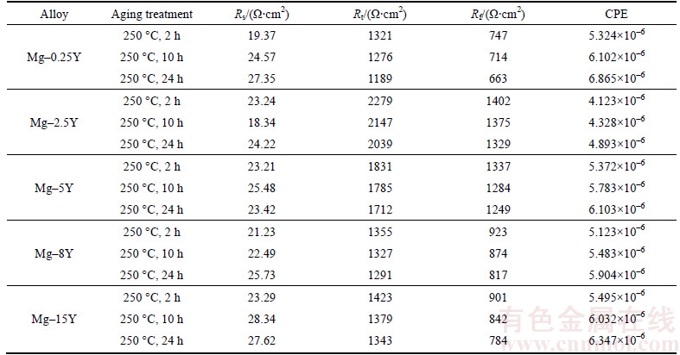 The high-frequency arc radius of the five alloys will decrease with aging treatment continuing, which indicated that the corrosion- resistance property would decrease with increasing of the aging time, the reason for which was that the precipitated Mg24Y5 phase accelerates the corrosion in the aging process.