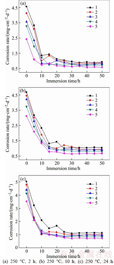 The saline water was the NaCl neutral solution with a concentration of 3.5%. The test temperature was (25±2) °C. Samples were continuously immersed in the solution, and taken out every 5 h. The corrosion products on the sample surface were cleaned with 20% CrO3. The change in the mass per unit area during the unit time, i.e. the average corrosion rate, is used to express the corrosion rate v (mg/(cm2·h)), as shown in the following formula [15]: