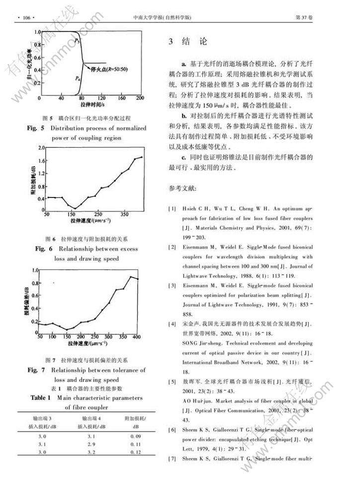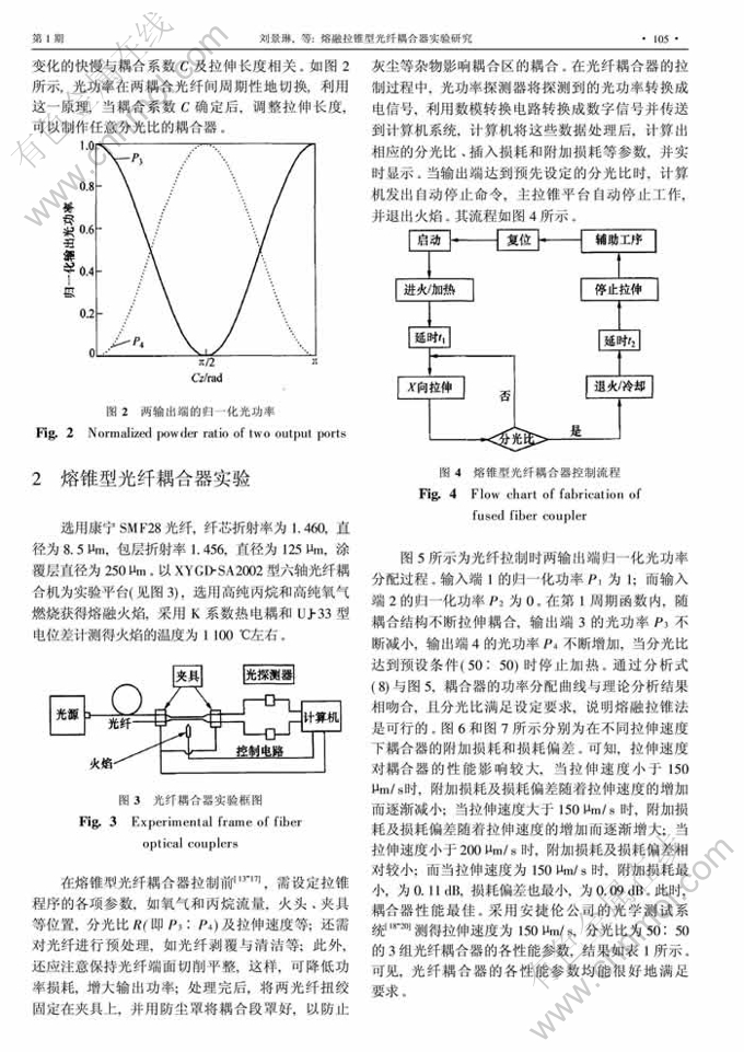 摘 要:根据光纤的消逝场耦合模理论,论述了熔融拉锥型光纤耦合器的工作原理;以六轴型熔融拉锥机为实验平台,研究了熔融拉锥法制作3 dB单模光纤耦合器的过程;分析了拉伸速度与附加损耗及损耗偏差的关系,发现拉伸速度为150μm/s时,耦合器的性能达到最优;此外,利用光学测试系统测试了光纤耦合器的插入损耗、附加损耗、方向性与均匀性等光谱特性参数。研究结果表明,所得实验结果与耦合理论分析结果吻合,说明该方法具有制作过程简单、附加损耗低、环境稳定以及成本低廉等优点。