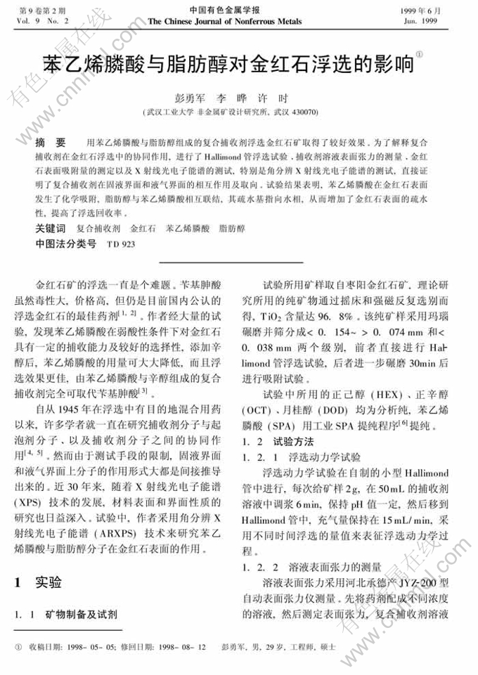 关键词:复合捕收剂 金红石 苯乙烯膦酸 脂肪醇
