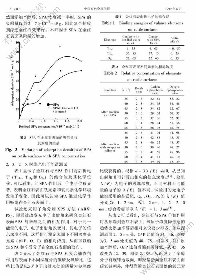 摘 要:用苯乙烯膦酸与脂肪醇组成的复合捕收剂浮选金红石矿取得了较好效果。为了解释复合捕收剂在金红石浮选中的协同作用,进行了Hallimond管浮选试验、捕收剂溶液表面张力的测量、金红石表面吸附量的测定以及X射线光电子能谱的测试,特别是角分辨X射线光电子能谱的测试,直接证明了复合捕收剂在固液界面和液气界面的相互作用及取向。试验结果表明,苯乙烯膦酸在金红石表面发生了化学吸附,脂肪醇与苯乙烯膦酸相互联结,其疏水基指向水相,从而增加了金红石表面的疏水性,提高了浮选回收率。