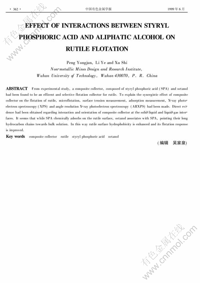 Key words:composite collector ; rutile ; styryl phosphoric acid ; octanol