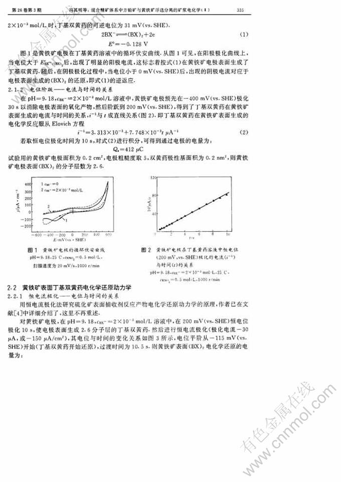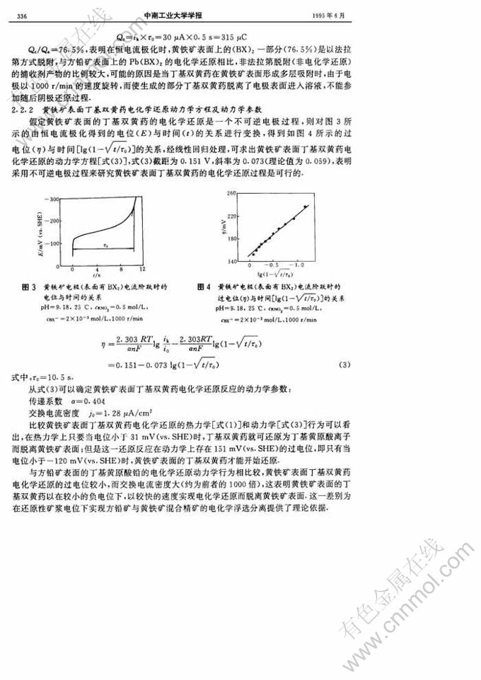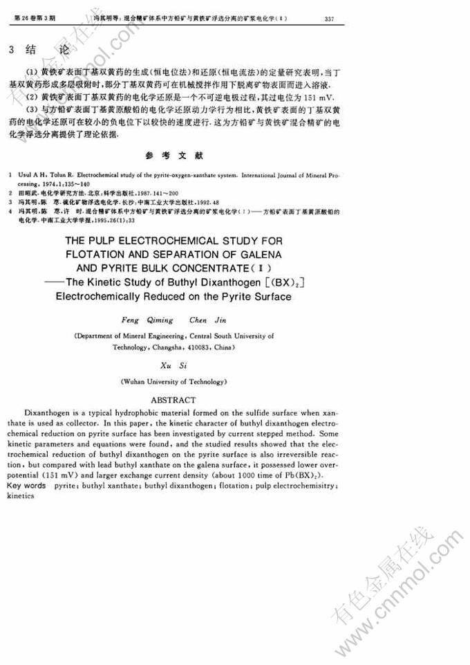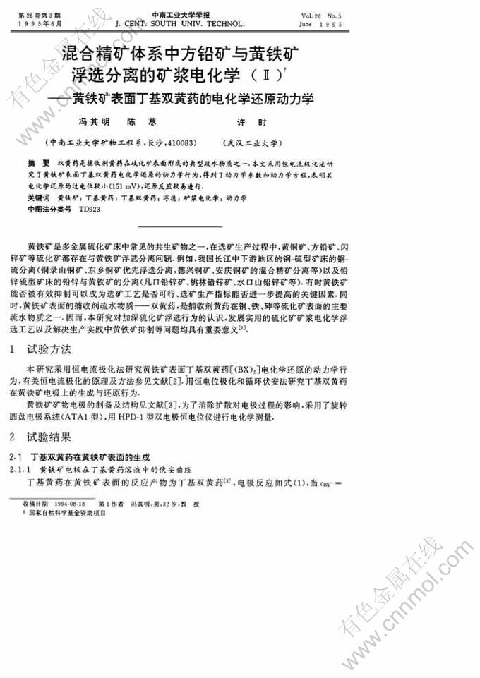 Key words:pyrite; buthyl xanthate; buthyl dixanthogen; flotation; pulp electrochemisitry; kinetics