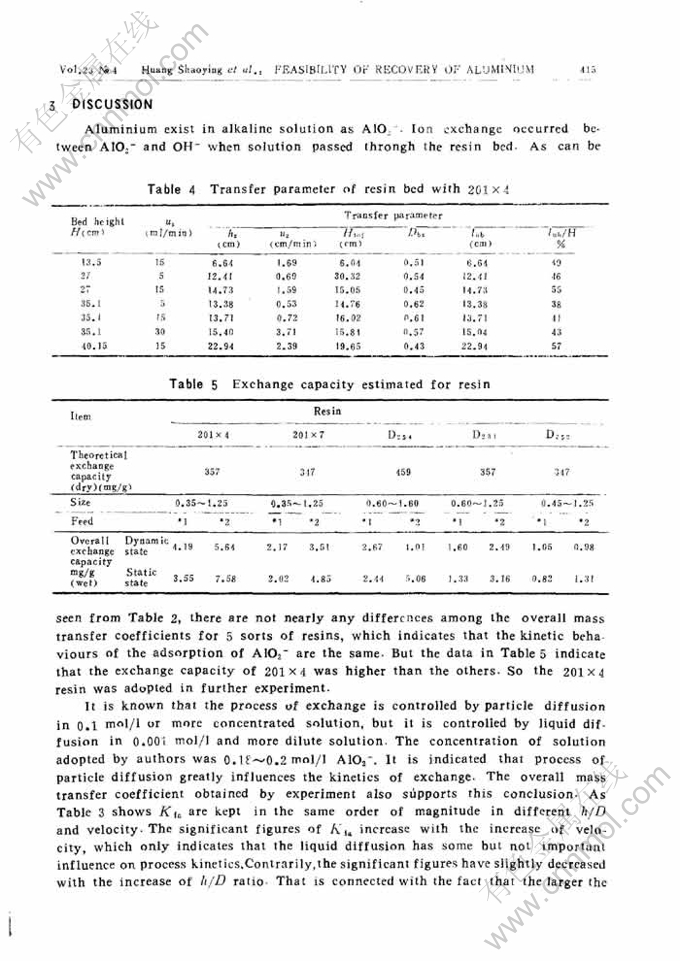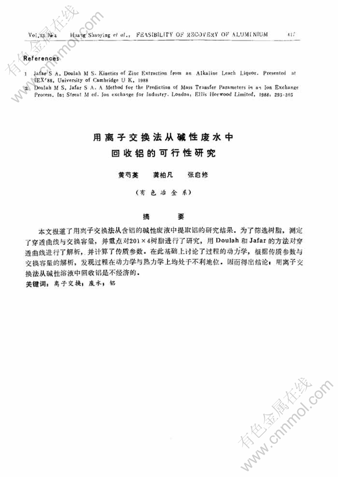 摘 要:本文报道了用离子交换法从含铝的碱性废液中提取铝的研究结果.为了筛选树脂,测定了穿透曲线与交换容量,并重点对201×4树脂进行了研究,用Doulah和Jafar的方法对穿透曲线进行了解析,并计算了传质参数.在此基础上讨论了过程的动力学,根据传质参数与交换容量的解析,发现过程在动力学与热力学上均处于不利地位.因而得出结论:用离子交换法从碱性溶液中回收铝是不经济的.
