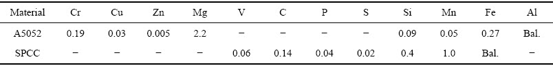 试验材料为1.0 mm厚的A5052铝合金和SPCC低碳钢,其化学组成见表1。利用固定式交流点焊机进行焊接。焊接时,为克服熔核偏移,在铝合金板上附加一枚材质为SPCC低碳钢(厚1.0 mm)的热补偿工艺垫片。关于热补偿工艺垫片电阻点焊的详细报道见文献[11]。焊接前,被焊材料和所用热补偿工艺垫片表面用无水乙醇洗净后烘干。所用点焊参数如下:焊接电流10 kA;焊接时间0.2 s;电极压力1715 N。所用电极的端面直径为6 mm。