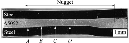图1所示为接头横断面的宏观照片。 从图1可以看出,有一个横断面为鼓型的熔核生成于铝合金内,而在低碳钢内没有观察到熔融的痕迹,这说明接头是液态铝和固态钢之间形成的。利用扫描电子显微镜沿铝合金/低碳钢接合界面进行了观察,图2所示为界面区的SEM像,其中,图2(a)、(b)、(c)与(d)所示分别取自图2中A、B、C和D处。