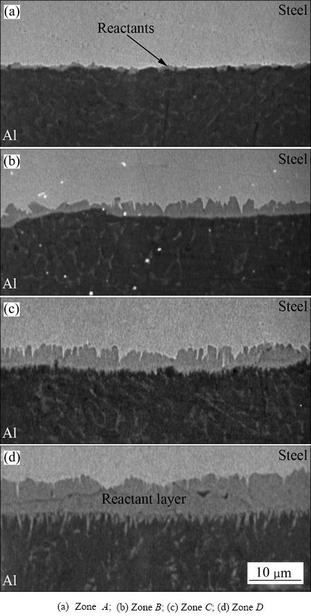 在形貌上,反应层和低碳钢间的界面凹凸起伏很大,表现为参差不齐。低碳钢一侧反应物像舌状,指向低碳钢侧(见图2(b)和(c))。随至焊点中心距离的减少,这些舌状反应物块逐渐增大,并且相邻舌状反应物块间的间隙也逐渐减小。在焊点中心处,相邻的舌状反应物块彼此接近,整个反应层如图2(d)所示变为带状层。