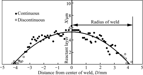 2) 反应层厚度随其在界面上的位置的变化而变化,其厚度呈中心厚外缘薄状分布。